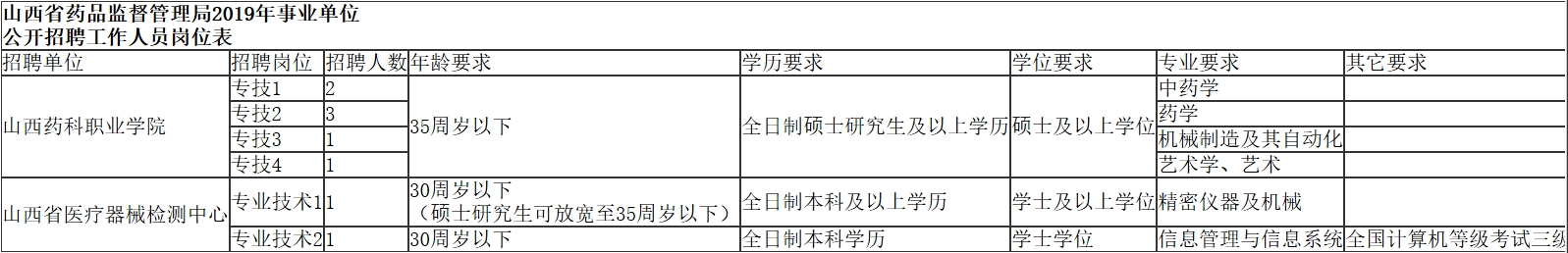 岗位所需的具体条件详见《山西省药品监督管理局2019年事业单位公开招聘工作人员岗位表》。