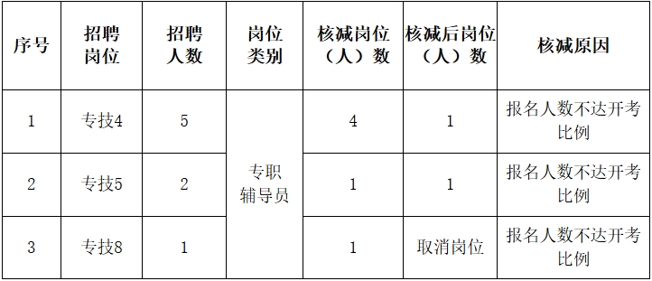 按照《ac米兰官网中文网站2019年公开招聘工作人员公告》要求 “岗位资格审查合格人数与拟招聘人数原则上应达3:1以上方可开考,报名人数不达该比例的招聘岗位,按规定的比例相应核减岗位,如减少到1名仍达不到3:1的岗位,原则上取消招聘岗位,并在发布公告的同一网站发布补充公告,同时负责告知被取消岗位的报名人员”,根据报名情况,经学院公开招聘领导组研究,决定核减部分岗位(人)数。现就相关事宜公告如下: