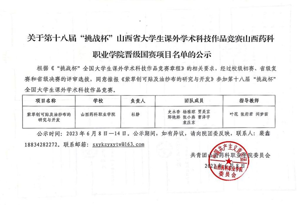 关于第十八届“挑战杯”山西省大学生课外学术科技作品竞赛ac米兰官网中文网站晋级国赛项目名单的公示