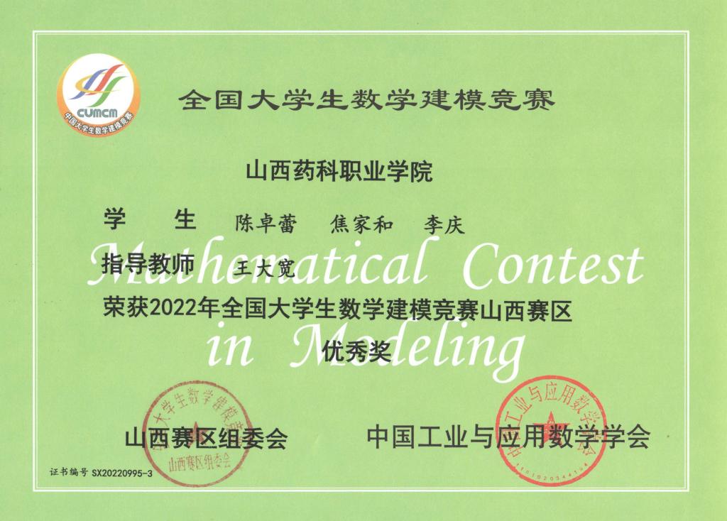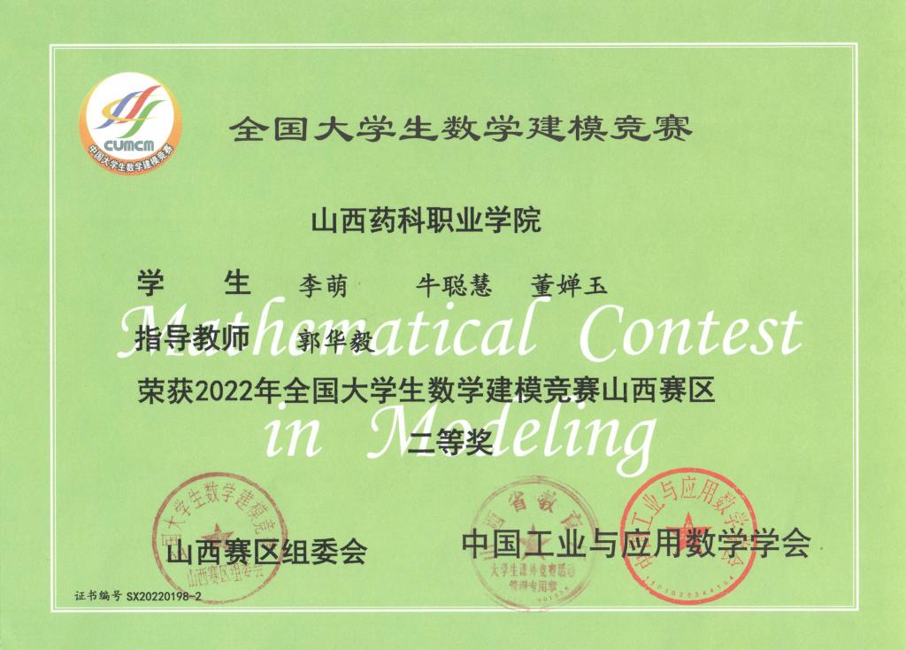 近日,2022年全国大学生数学建模竞赛山西赛区颁奖仪式在山西财政税务专科学校进行,ac米兰学生在此次比赛中取得优异成绩。其中李萌、牛聪慧、董婵玉荣获山西赛区二等奖,蒙海燕、张婉颖、范晓迪荣获山西赛区三等奖,陈卓蕾、焦家和、李庆荣获优秀奖。
