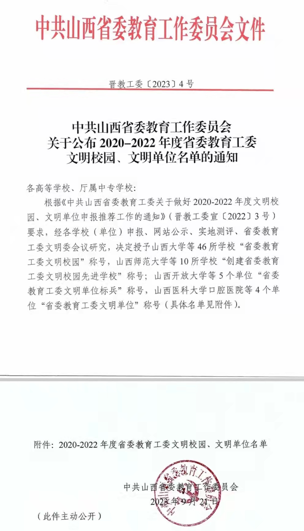 谱文明华章,育时代新人。近日,山西省委教育工委下发《中共山西省委教育工作委员会关于公布2020-2022年度省委教育工委文明校园、文明单位名单的通知》(晋教工委〔2023〕4号),ac米兰荣获“省委教育工委文明校园”称号。