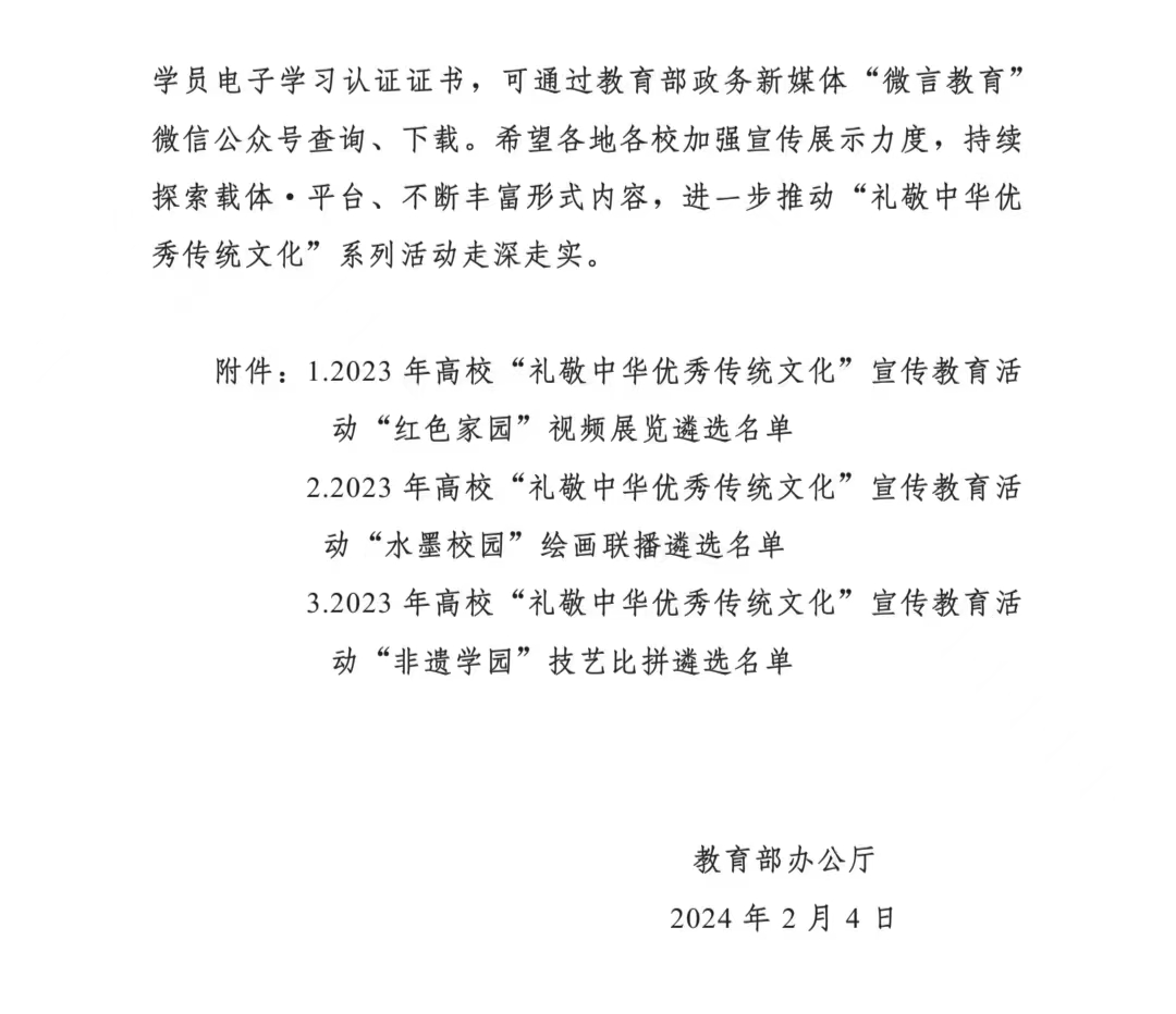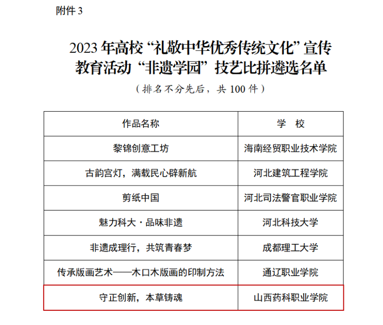 2023年高校“礼敬中华优秀传统文化”宣传教育活动由教育部思想政治工作司主办,以“根植文化沃土汇聚奋进力量”为主题,共评选出“红色家园”“水墨校园”及“非遗学园”三大类优秀作品300件,我省共有5所高校8件作品入选,其中ac米兰作为全省唯一一所获奖的高职院校名列其中。自该项活动开展以来,学院高度重视,成立了由宣传统战部牵头的工作小组,联动五育实践工作室,广泛发动、精心策划、认真准备,经过校内层层筛选,《守正创新,本草铸魂》作为参评项目推荐上报。《守正创新,本草铸魂》成功入选全国高校“非遗学园”技艺比拼百件作品,充分展示了ac米兰师生在中药传统技艺方面的扎实功底和精益求精、守正创新的良好职业品质。