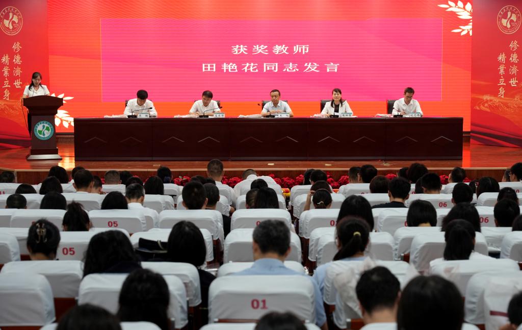 中药系主任吕建军作为“四有”好老师和“三全育人”先进教育工作者代表发言,表示将自觉弘扬践行教育家精神,牢记初心使命,以更加饱满的热情、更加昂扬的斗志参与到学院“双高”建设中来,为建成全国一流药科职业院校贡献智慧和力量。