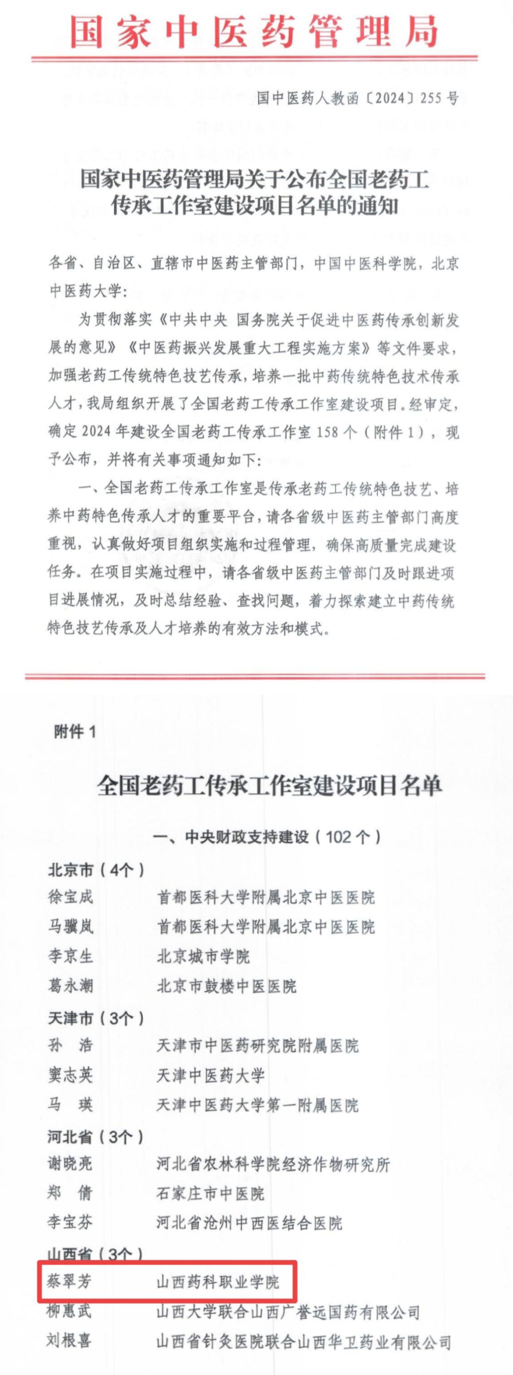 日前,国家中医药管理局公布2024年全国老药工传承工作室建设项目名单,来自全国各省市区共计158个建设项目获批,其中山西省获批3项,ac米兰“蔡翠芳老药工传承工作室”成功入选。