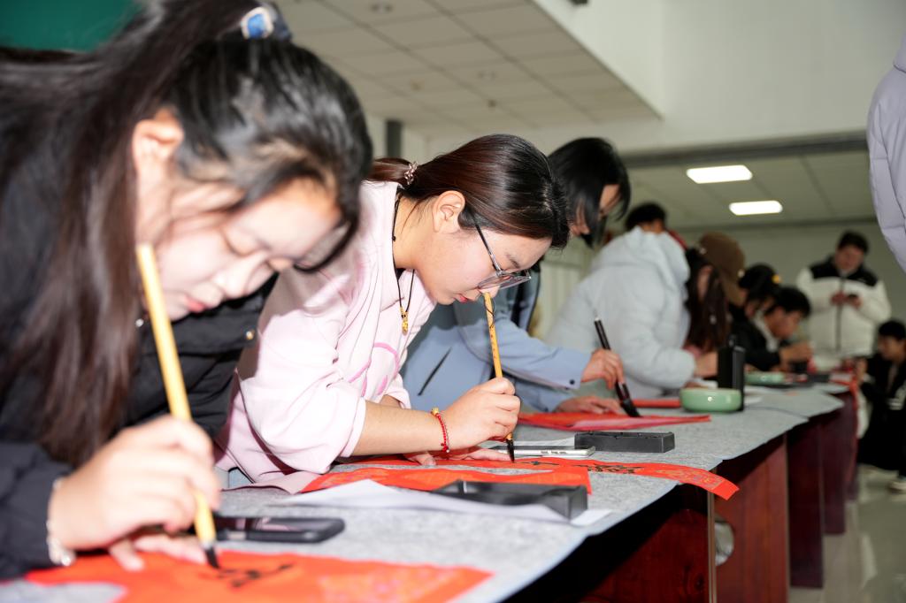 活动现场,笔墨飘香,气氛热烈。学院书法爱好者和书法协会学员挥毫泼墨,将一幅幅寓意深刻、笔力遒劲的春联作品呈现给大家,一笔一划间传递着对新年的美好祝愿和对传统文化的热爱。展示区,红彤彤的春联挂满了展板,成为了冬日里一道亮丽的风景线,吸引了众多师生驻足品鉴。此外,活动还特别设置了现场发放春联环节,为在场的师生发放了充满祝福的春联。