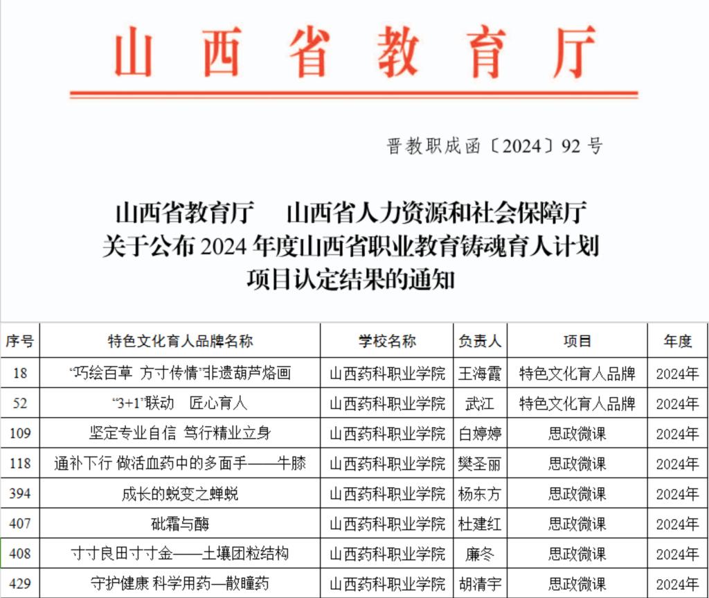 近日,山西省教育厅公布2024年度职业教育铸魂育人计划项目认定结果,ac米兰铸魂育人“三个一工程”建设喜获佳绩,其中“巧绘百草,方寸传情”非遗葫芦烙画等2个项目被认定为特色文化育人品牌,《坚定专业自信 笃行精业立身》等6个微课被认定为省级职业教育思政微课。