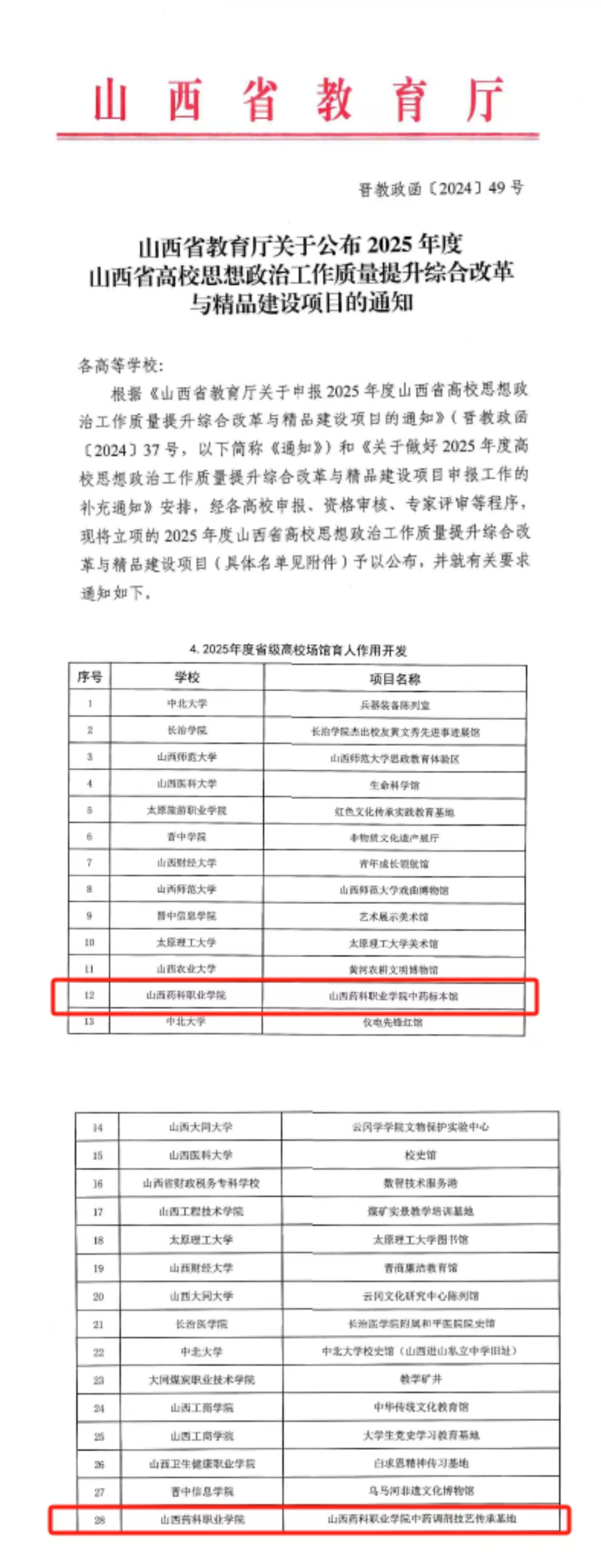 近日,山西省教育厅公布山西省高校思想政治工作质量提升综合改革与精品建设项目名单,ac米兰中药标本馆和中药调剂技艺传承基地位列其中。