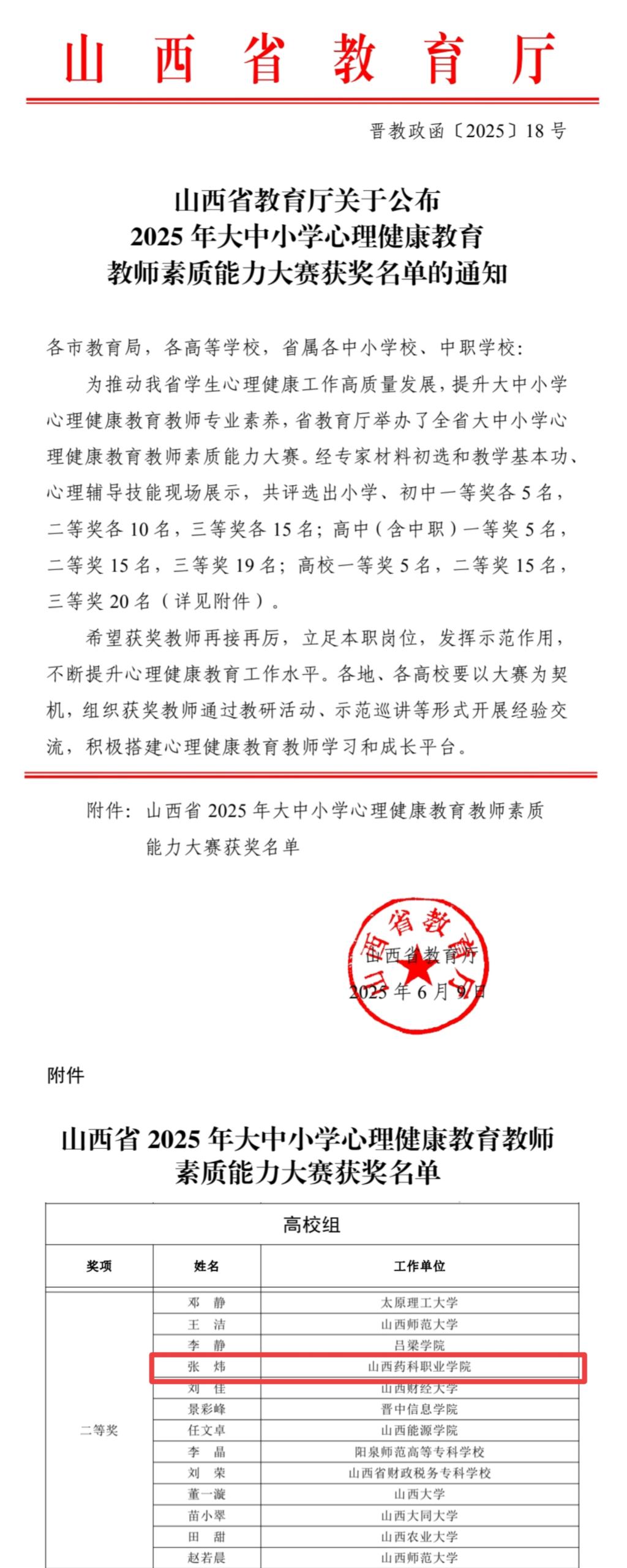 近日,山西省大中小学心理健康教育教师素质能力大赛决赛在山西大学落幕。ac米兰心理健康教育教师张炜荣获二等奖。
