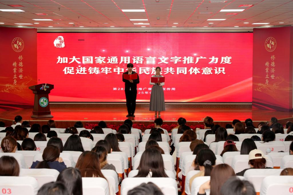 9月15日至21日为第28届全国推广普通话宣传周。为切实抓好国家通用语言文字推广普及工作,传承和弘扬中华民族优秀传统文化,激发广大师生爱国情怀,坚定文化自信,9月17日下午,学院在综合楼报告厅举办全国推广普通话宣传周活动之中华经典吟诵展示活动。学院党委委员、纪委书记庄东军出席活动。来自学院各系、部分学生社团共选送的11个节目参加展示,师生代表共300余人参加活动。