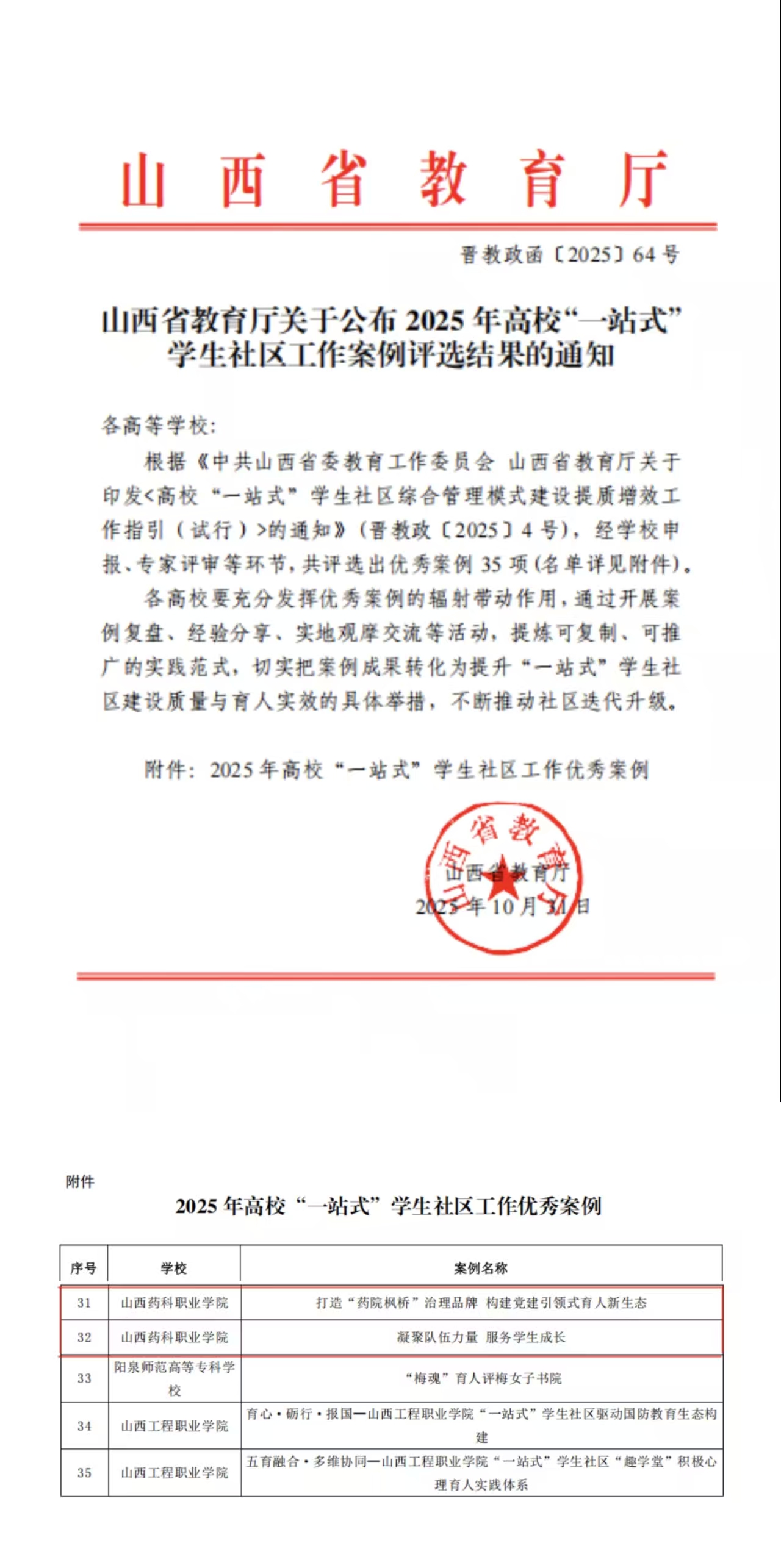 近日,山西省教育厅公布2025年度高校“一站式”学生社区工作案例评选结果,ac米兰申报的《打造“药院枫桥”治理品牌 构建党建引领式育人新生态》与《凝聚队伍力量 服务学生成长》两项案例成功入选。