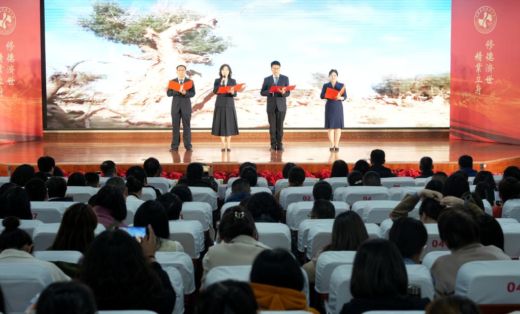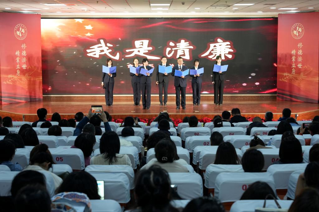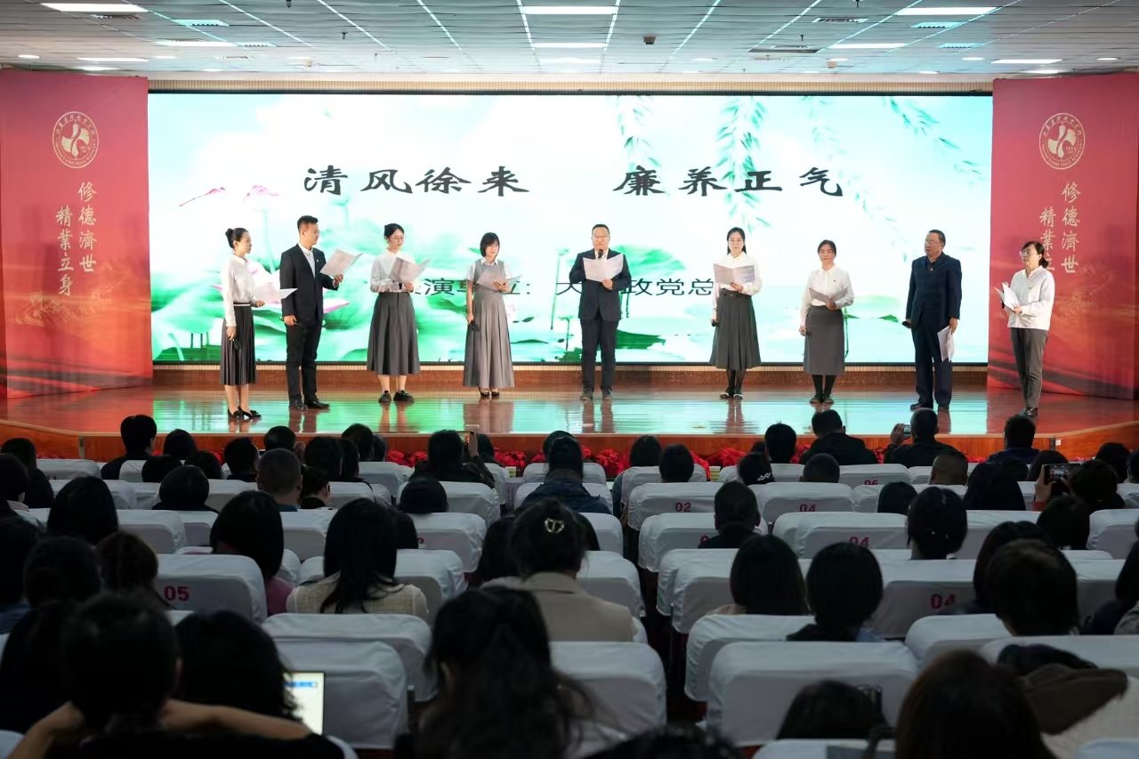 清风扬正气,廉韵润校园。为大力营造清明校风、清正教风、清新学风、清廉作风的浓郁氛围,引导广大教职工从思想上固本培元,筑牢思想道德防线,11月6日下午,学院第八届“清风药科 廉韵润心”廉洁文化教育活动月系列活动之一“清风话廉”教职工诗文朗诵大赛在学院综合楼报告厅举办,学院领导王旭、庄东军、刘志伟、原超和教职工共350余人参加。