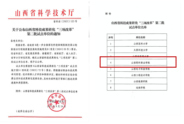 近日,山西省科技厅正式发布科技成果转化“三项改革”第二批试点单位名单。ac米兰凭借在科研创新领域的持续深耕、成果转化机制改革的积极推进,以及产学研深度融合方面的有力探索,成功跻身省级试点单位之列。