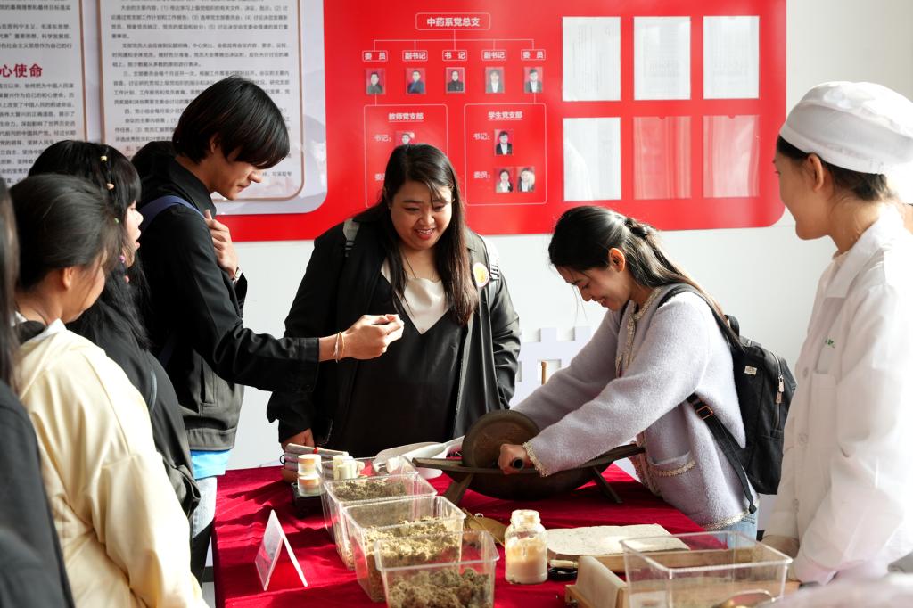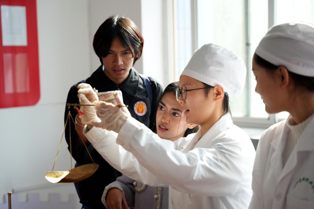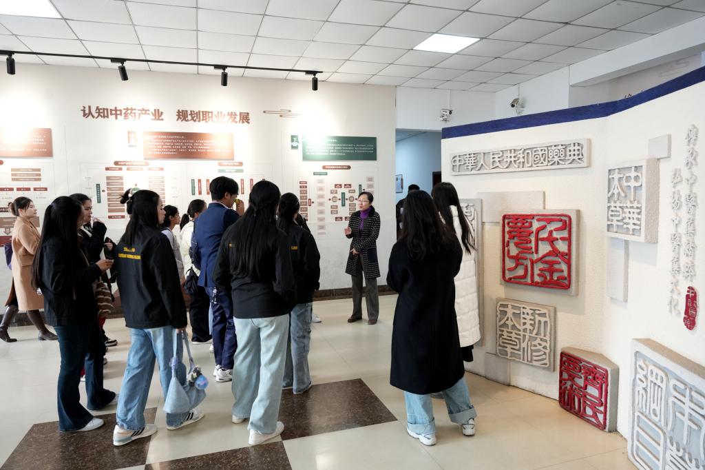 泰国师生实地参观了中药标本厅、中药调剂技艺传承基地、百草大药房、药・茶技能技艺传承与创新实训基地以及传统文化教育学习室等一系列极具中华文化底蕴的育人场所,ac米兰讲解员为其详细介绍了中医药文化的丰富内容和深厚内涵,使其对我国中药传统文化、中医传统调剂技艺以及传统茶文化有了更为直观和深刻的理解。