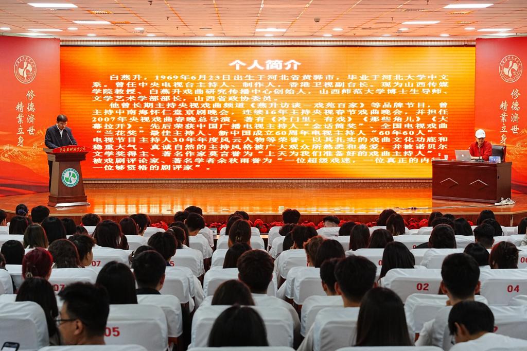 接着,白燕升结合自身职业生涯的丰富积淀及对戏曲和传统文化的思考感悟,通过中外艺术家追求艺术的生动事例,声情并茂讲述了艺术超越时空的魅力,深入浅出解读了审美与生活、艺术与人性的关系,引发了大家对“人性是最终的审美对象”的深入思考。白燕升鼓励同学们要树立正确的审美观和人文交流观,让生活之美浸润心灵,将艺术与生活对接,将审美与人性相通,承担起新时代传承创新中华优秀传统文化的历史使命。