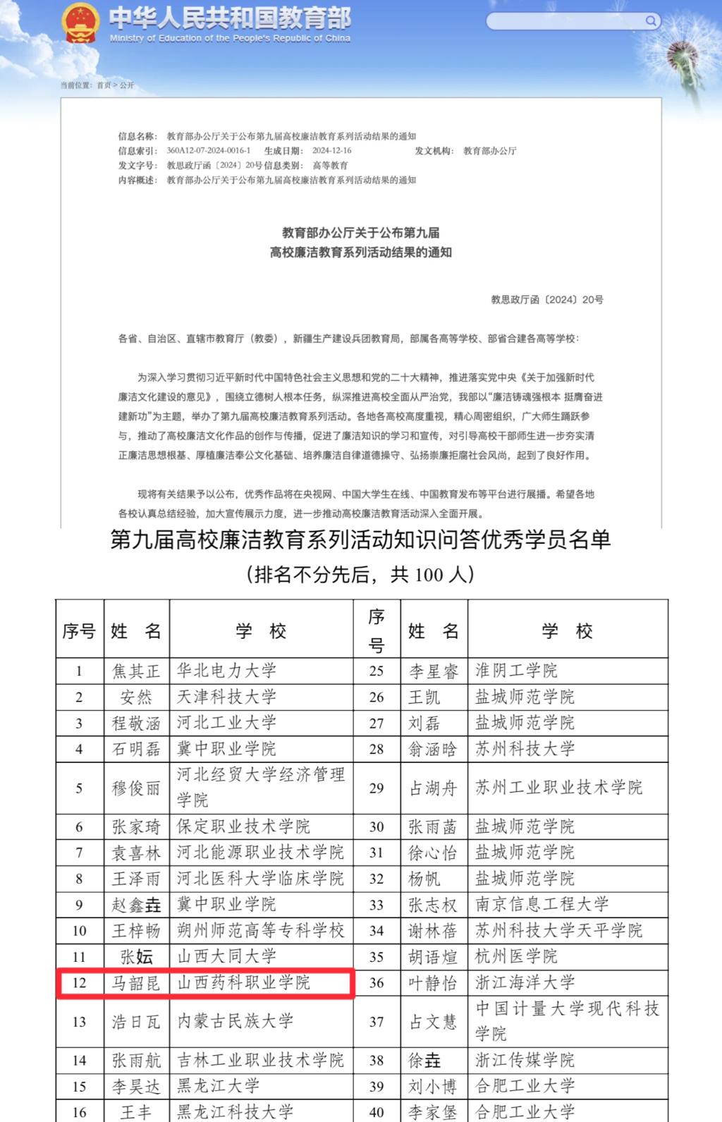 近日,教育部公布了第九届高校廉洁教育系列活动评选结果,ac米兰2023级药学16班马韶昆同学在众多参赛者中脱颖而出,荣获知识问答“优秀学员”称号,为学院赢得了荣誉。